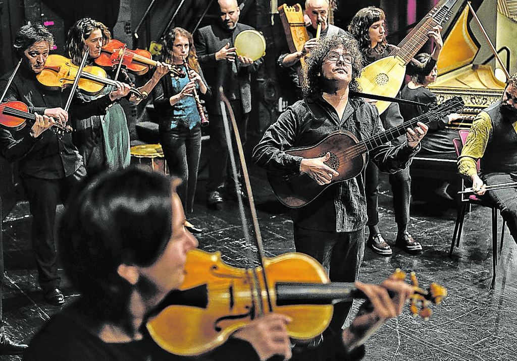 Entretenido y variado espectáculo el ofrecido por la recién creada orquesta profesional que divulgará la música compuesta entre los siglos XVII y XVIII. De manera inteligente, el proyecto encabezado por su director y guitarrista Enrique Solinís aunó la música barroca francesa, inglesa e italiana con la popular vasca de las “Maskaradas” suletinas y Zuberoa. Con un color elegante y exquisita compenetración, la agrupación vasca recorrió con gran conjunción y maestría interpretativa la música de Lully o Purcell. Tanto los veinte componentes con sus tiorbas, flautas de pico y archilaúdes como la Txirula y el Ttun Ttun de Etxekopar nos ofrecieron una mezcla de la refinada música de otras fronteras al alimón con la de Iparralde. Entre los solistas, mencionemos a la soprano Anna Piroli quien se distinguió en el canto doliente, en las varias arias melancólicas que cantó como la de Lully “Sparite svanite fuggite da me” que la artista cremonense interpretó con gran expresividad. Mención especial también para el bertsolari Julio Soto por clara declamación. Asistimos a una “Mascarada” en forma de entretenimiento festivo, que floreció en Italia y pasó luego a Francia e Inglaterra y que como tal incluía música y canto además de la danza que pudimos admirar del grupo “Berritzako Dantzariak”.