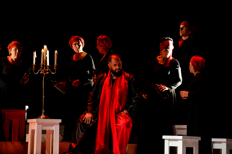 Fue un lujo contar con el maestro Ivan Ciampa en la dirección ya que estuvo atento a los cantantes, a los que dejó cantar a sus anchas y se mostró muy enérgico y ordenante con la Sinfónica de Bilbao. Una escueta y hasta pobre producción enmarcó la ópera de Verdi, en la que un trajín de mesas y taburetes sin fin iba y venía por el escenario y en la que un parco vestuario negro se emparentó con la negrura de la escena, mientras que al fondo, unas abstractas proyecciones pretendían adornarla.