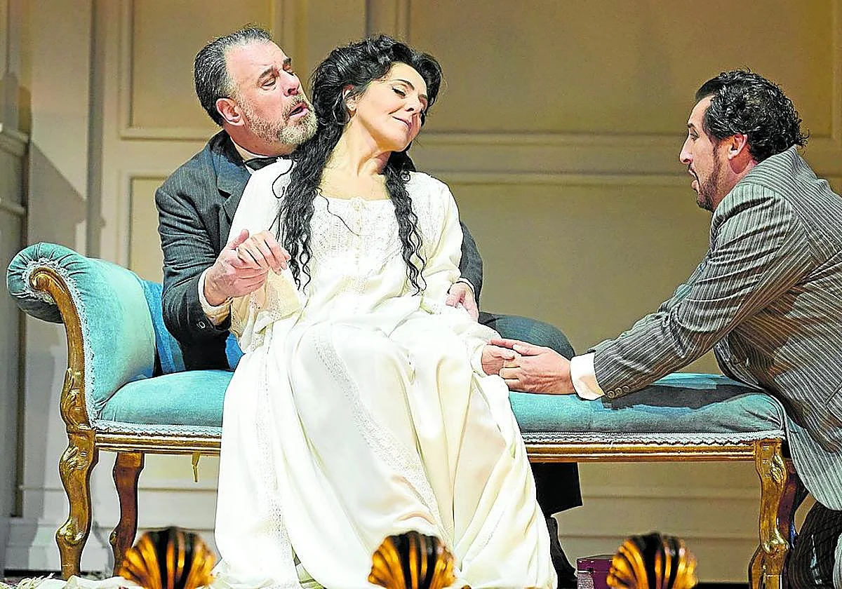 Finalmente, y tras varios títulos de menesterosas puestas en escena, pudimos contemplar el sábado una producción de hermosa factura. La elegancia de la escenografía se unió al cuidado vestuario de época y hasta disfrutamos de verdad con la escena de la danza que pocas veces se ha presentado con dignidad. Una producción lujosa no podía ir de la mano de una intérprete que no fuera distinguida. De ahí que María Agresta la soprano que encarnó el rol de la actriz teatral, mereció la admiración general y no sólo por su hermosa voz, llena y su amplio fiato, sino porque su desenvoltura teatral nos pareció magnífica en cuanto a entrega y expresividad. Si la bellísima aria “Io son l´umile ancella” del principio contó con una versión sin mácula, mejor fue aún su aria final “Poveri Fiori” cantada con gran carga emocional, belleza lineal y control absoluto, culminando así un papel muy apropiado para ella. Su amado Mauricio, interpretado por Jorge de León se mostró siempre seguro en la dificultad evidenciando la brillantez de sus notas altas tan “squillantes”. Como tenor “spinto” que es y al cantar con mayor empuje, no prodigó la media voz y se nos hizo un tanto antagónico con el verismo cortesano que requiere algo más de elegancia en el canto. Ahora bien, dejó en muy alto lugar su versión calmada y grave del aria “L´anima o stanca” y en la actualidad no hay muchos tenores que afronten con su valentía este tipo de papeles aptos para grandes voces. La voz de la mezzo Silvia Tro la escuchamos con agrado en su aria “Acerba Volutá” la cual se nos hizo brillante, así como luego nos complacería en la réplica a la soprano en el hermoso dúo amoroso entre ambas. Por otro lado, volvía a Bilbao el barítono malagueño Carlos Alvarez en el papel de Michonnet. Aunque sin la sonoridad de antaño, siguió enseñando el terciopelo de su voz, el fraseo tan intencionado y una labor teatral comedida al dotar a su personaje de la lealtad y la timidez del enamorado con lo que resultó automáticamente empático. Distingamos finalmente al coro, sobre todo la parte femenina en la escena de la danza y un aplauso para el cuarteto que resolvió meritoriamente los dos complicados y rápidos concertantes. Volvía también a Bilbao el maestro Marco Armiliato y diremos en su favor que, si la hermosa música y la cuidada melodía de Cilea mereció la esplendidez, fue gracias a su experta batuta dirigiendo a la Sinfónica bilbaína. Ello, no solo porque permitió brillar a las voces con un tempo acorde a sus necesidades, sino porque captó muy bien la intensidad dramática de la obra.